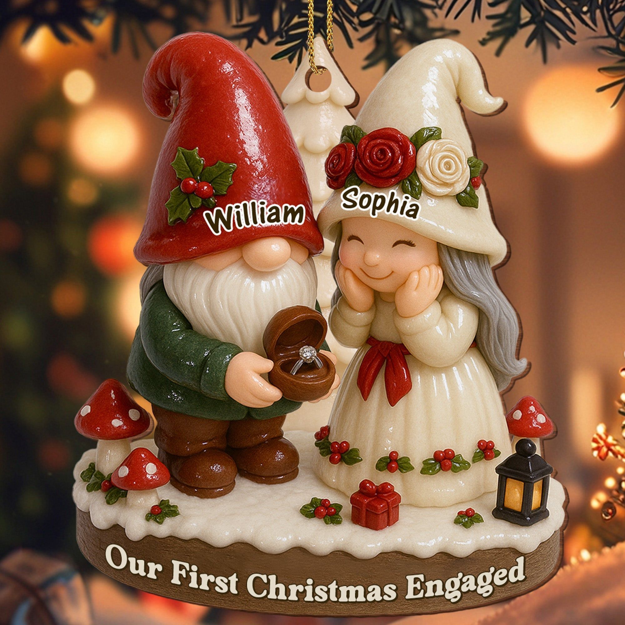 Our First Christmas Engaged With Gnomes - Personalized Custom Wood Ornament, Custom Shaped